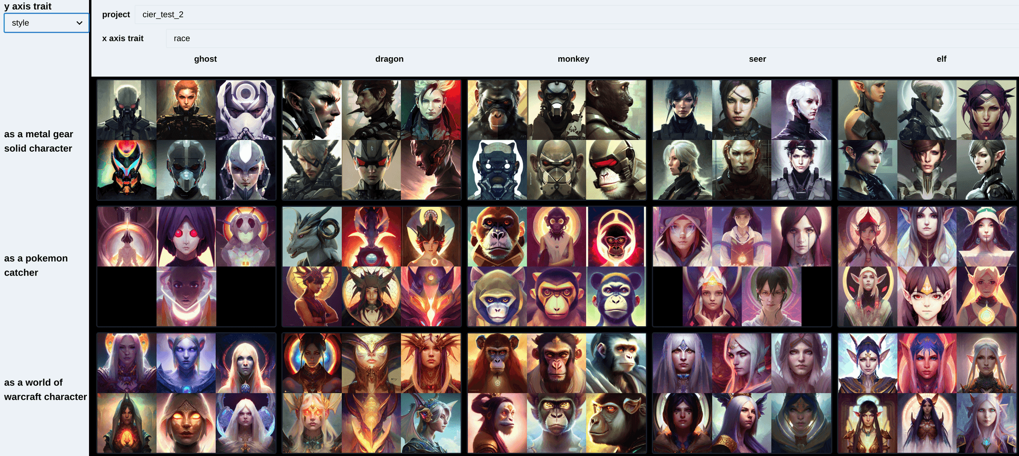 We can select which values change on each axis. In the image above, the columns show different races, while the rows show different styles.